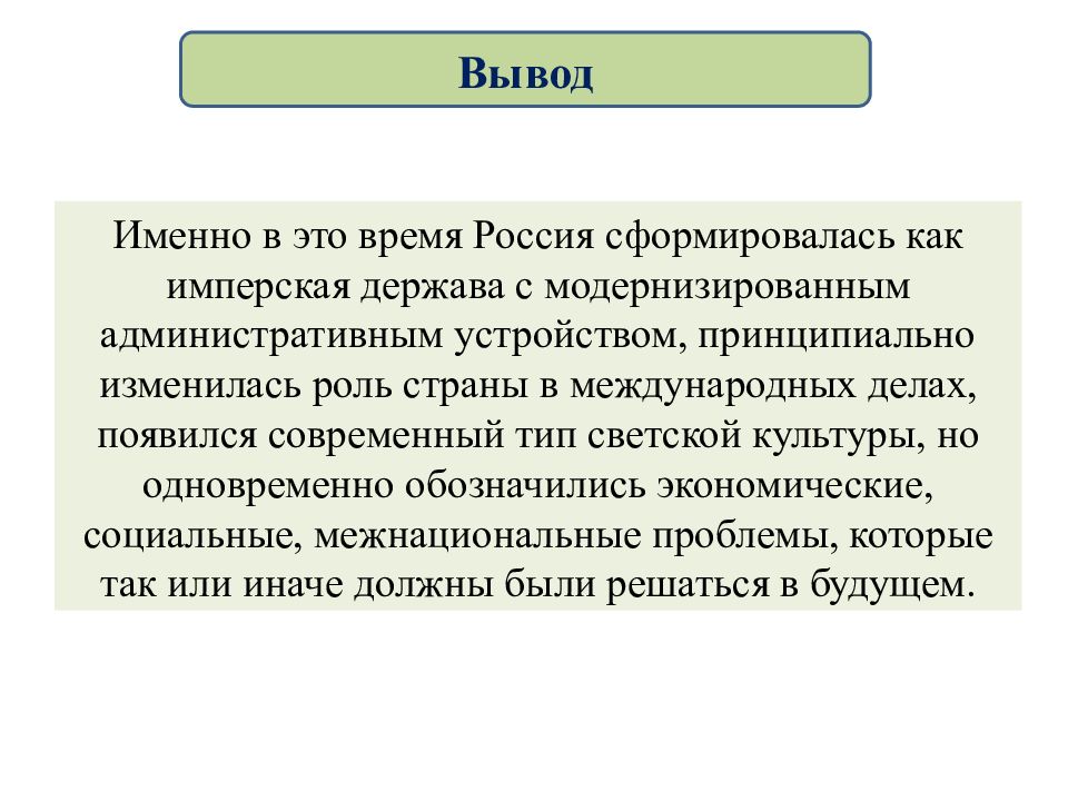 Именно в это время Россия сформировалась как имперская держава с модернизированным административным устройством, принципиально изменилась роль страны в международных делах, появился современный тип светской культуры, но одновременно обозначились экономические, социальные, межнациональные проблемы, которые так или иначе должны были решаться в будущем. Вывод
