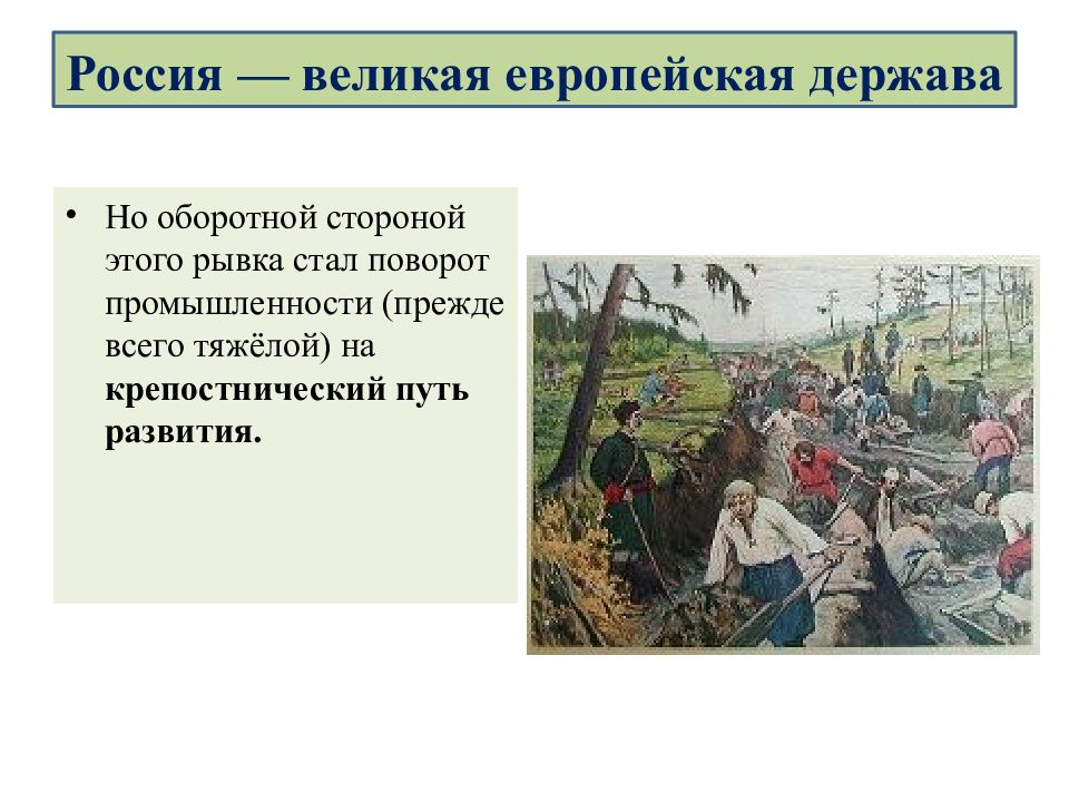 Но оборотной стороной этого рывка стал поворот промышленности (прежде всего тяжёлой) на крепостнический путь развития. Россия — великая европейская держава