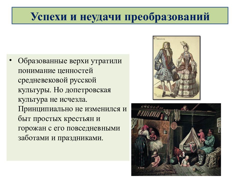Образованные верхи утратили понимание ценностей средневековой русской культуры. Но допетровская культура не исчезла. Принципиально не изменился и быт простых крестьян и горожан с его повседневными заботами и праздниками. Успехи и неудачи преобразований