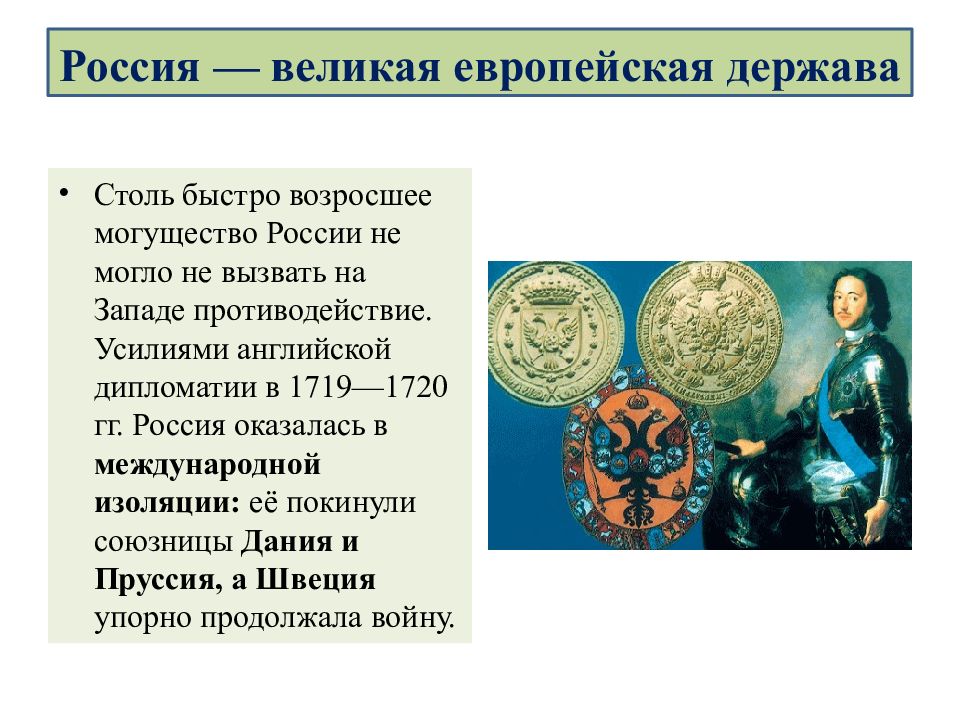 Столь быстро возросшее могущество России не могло не вызвать на Западе противодействие. Усилиями английской дипломатии в 1719—1720 гг. Россия оказалась в международной изоляции: её покинули союзницы Дания и Пруссия, а Швеция упорно продолжала войну. Россия — великая европейская держава