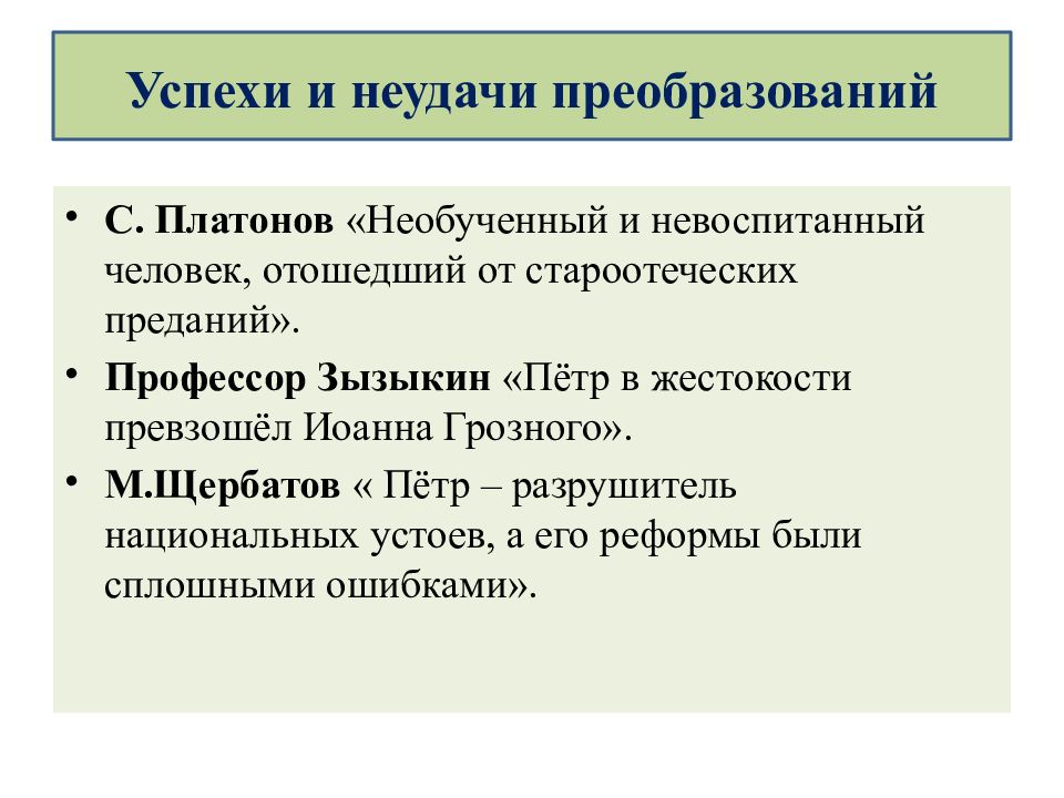 С. Платонов «Необученный и невоспитанный человек, отошедший от староотеческих преданий». Профессор Зызыкин «Пётр в жестокости превзошёл Иоанна Грозного». М.Щербатов « Пётр – разрушитель национальных устоев, а его реформы были сплошными ошибками». Успехи и неудачи преобразований