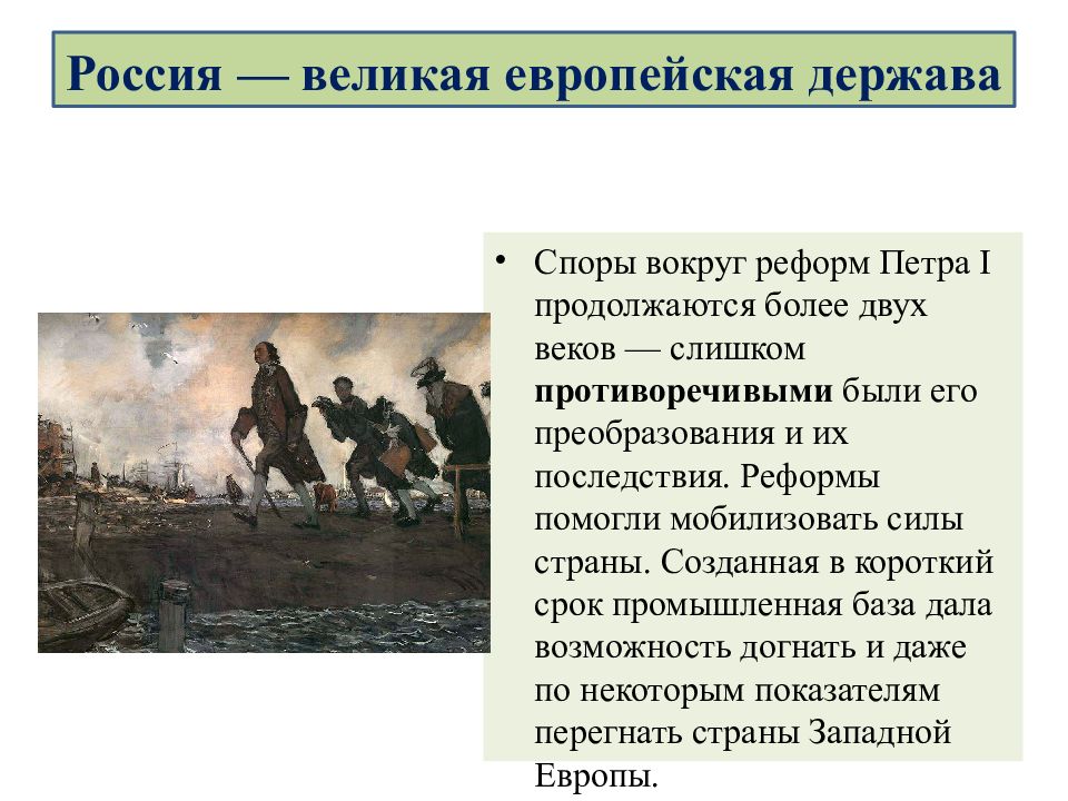 Споры вокруг реформ Петра I продолжаются более двух веков — слишком противоречивыми были его преобразования и их последствия. Реформы помогли мобилизовать силы страны. Созданная в короткий срок промышленная база дала возможность догнать и даже по некоторым показателям перегнать страны Западной Европы. Россия — великая европейская держава