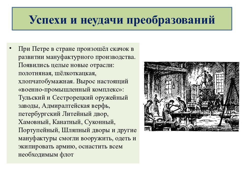 При Петре в стране произошёл скачок в развитии мануфактурного производства. Появились целые новые отрасли: полотняная, шёлкоткацкая, хлопчатобумажная. Вырос настоящий «военно-промышленный комплекс»: Тульский и Сестрорецкий оружейный заводы, Адмиралтейская верфь, петербургский Литейный двор, Хамовный, Канатный, Суконный, Портупейный, Шляпный дворы и другие мануфактуры смогли вооружить, одеть и экипировать армию, оснастить всем необходимым флот Успехи и неудачи преобразований