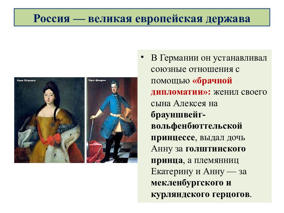 В Германии он устанавливал союзные отношения с помощью «брачной дипломатии»: женил своего сына Алексея на брауншвейг-вольфенбюттельской принцессе, выдал дочь Анну за голштинского принца, а племянниц Екатерину и Анну — за мекленбургского и курляндского герцогов. Россия — великая европейская держава