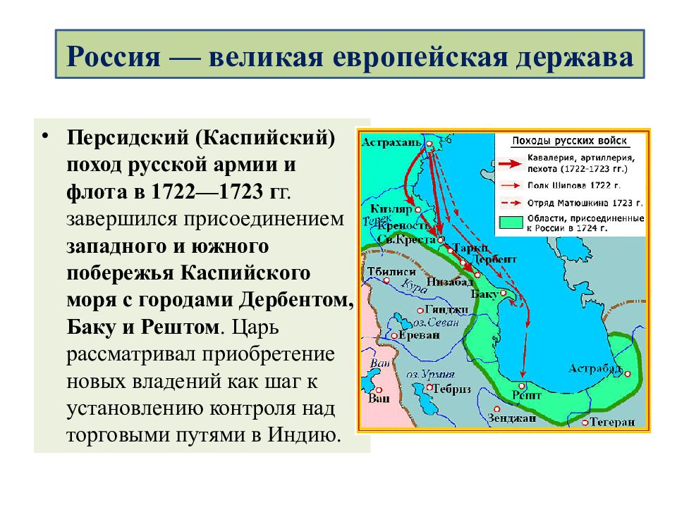 Персидский (Каспийский) поход русской армии и флота в 1722—1723 г г. завершился присоединением западного и южного побережья Каспийского моря с городами Дербентом, Баку и Рештом. Царь рассматривал приобретение новых владений как шаг к установлению контроля над торговыми путями в Индию. Россия — великая европейская держава