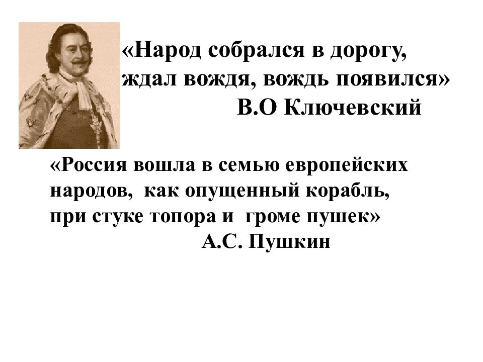 «Народ собрался в дорогу, ждал вождя, вождь появился» В.О Ключевский «Россия вошла в семью европейских народов, как опущенный корабль, при стуке топора и громе пушек» А.С. Пушкин