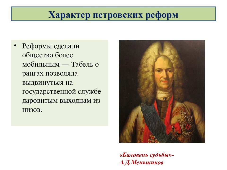 Реформы сделали общество более мобильным — Табель о рангах позволяла выдвинуться на государственной службе даровитым выходцам из низов. «Баловень судьбы»- А.Д.Меньшиков Характер петровских реформ