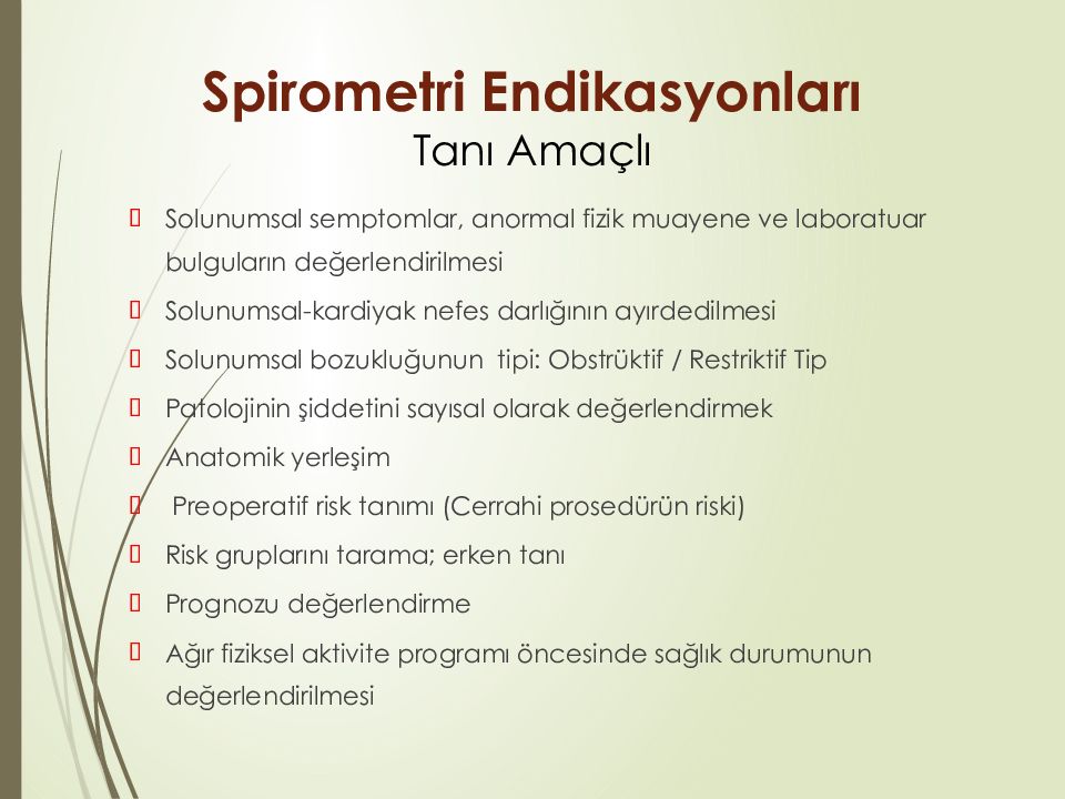 Solunumsal semptomlar, anormal fizik muayene ve laboratuar bulguların değerlendirilmesi Solunumsal-kardiyak nefes darlığının ayırdedilmesi Solunumsal bozukluğunun tipi: Obstrüktif / Restriktif Tip Patolojinin şiddetini sayısal olarak değerlendirmek Anatomik yerleşim Preoperatif risk tanımı (Cerrahi prosedürün riski) Risk gruplarını tarama; erken tanı Prognozu değerlendirme Ağır fiziksel aktivite programı öncesinde sağlık durumunun değerlendirilmesi Spirometri Endikasyonları Tanı Amaçlı