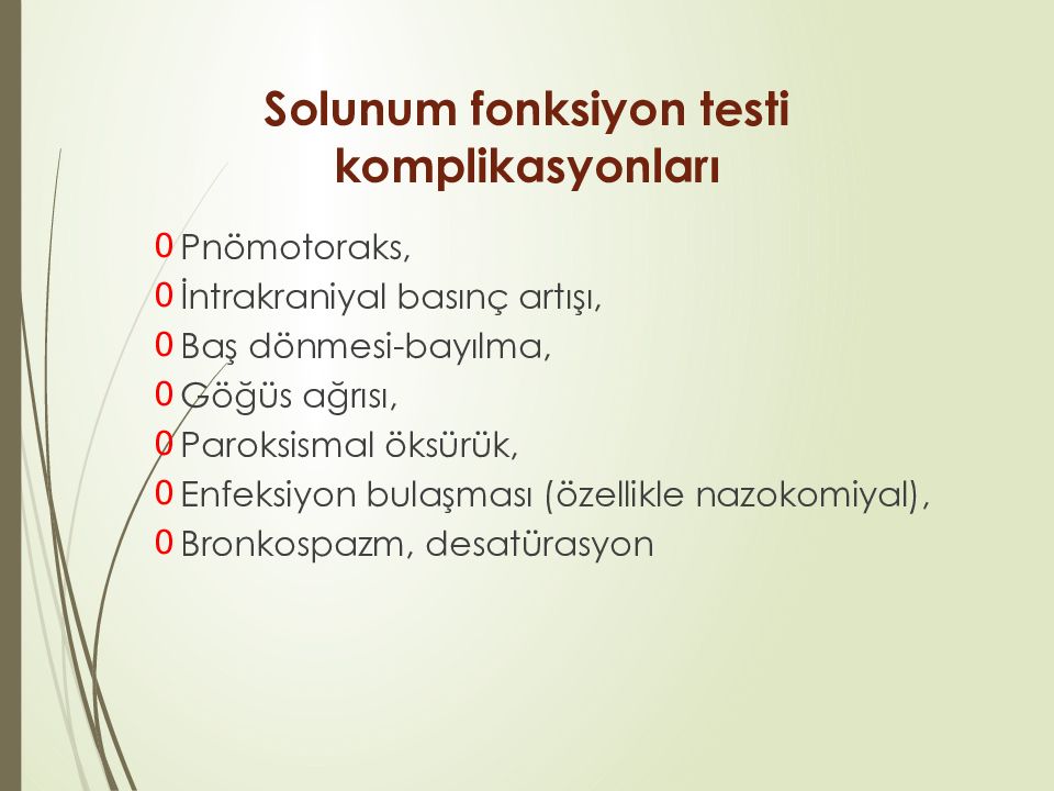 Pnömotoraks, İntrakraniyal basınç artışı, Baş dönmesi-bayılma, Göğüs ağrısı, Paroksismal öksürük, Enfeksiyon bulaşması (özellikle nazokomiyal), Bronkospazm, desatürasyon Solunum fonksiyon testi komplikasyonları