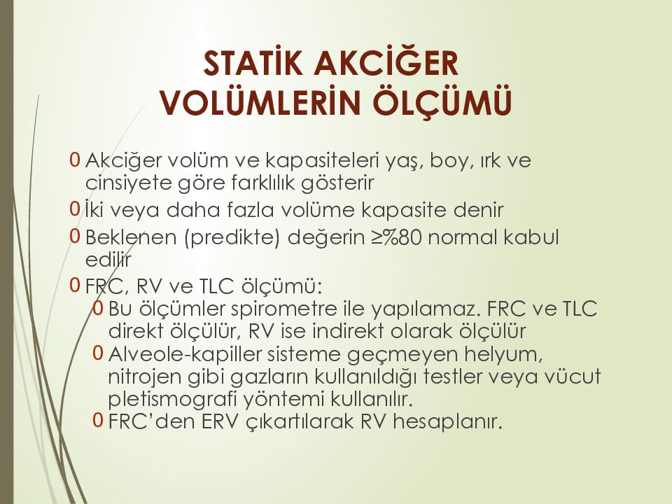 Akciğer volüm ve kapasiteleri yaş, boy, ırk ve cinsiyete göre farklılık gösterir İki veya daha fazla volüme kapasite denir Beklenen (predikte) değerin ≥%80 normal kabul edilir FRC, RV ve TLC ölçümü: Bu ölçümler spirometre ile yapılamaz. FRC ve TLC direkt ölçülür, RV ise indirekt olarak ölçülür Alveole-kapiller sisteme geçmeyen helyum, nitrojen gibi gazların kullanıldığı testler veya vücut pletismografi yöntemi kullanılır. FRC’den ERV çıkartılarak RV hesaplanır. STATİK AKCİĞER VOLÜMLERİN ÖLÇÜMÜ