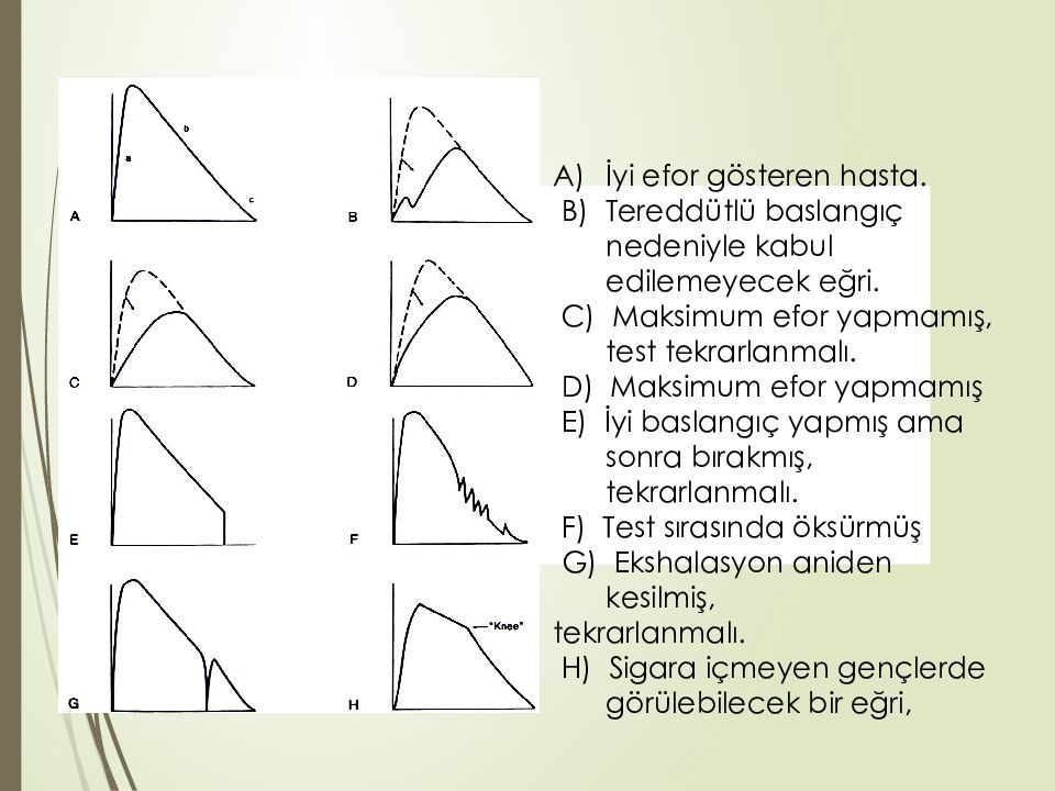 İyi efor gösteren hasta. B) Tereddütlü baslangıç nedeniyle kabul edilemeyecek eğri. C) Maksimum efor yapmamış, test tekrarlanmalı. D) Maksimum efor yapmamış E) İyi baslangıç yapmış ama sonra bırakmış, tekrarlanmalı. F) Test sırasında öksürmüş G) Ekshalasyon aniden kesilmiş, tekrarlanmalı. H) Sigara içmeyen gençlerde görülebilecek bir eğri,