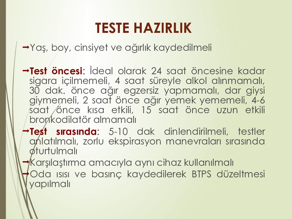 Yaş, boy, cinsiyet ve ağırlık kaydedilmeli Test öncesi : İdeal olarak 24 saat öncesine kadar sigara içilmemeli, 4 saat süreyle alkol alınmamalı, 30 dak. önce ağır egzersiz yapmamalı, dar giysi giymemeli, 2 saat önce ağır yemek yememeli, 4-6 saat önce kısa etkili, 15 saat önce uzun etkili bronkodilatör almamalı Test sırasında : 5-10 dak dinlendirilmeli, testler anlatılmalı, zorlu ekspirasyon manevraları sırasında oturtulmalı Karşılaştırma amacıyla aynı cihaz kullanılmalı Oda ısısı ve basınç kaydedilerek BTPS düzeltmesi yapılmalı TESTE HAZIRLIK