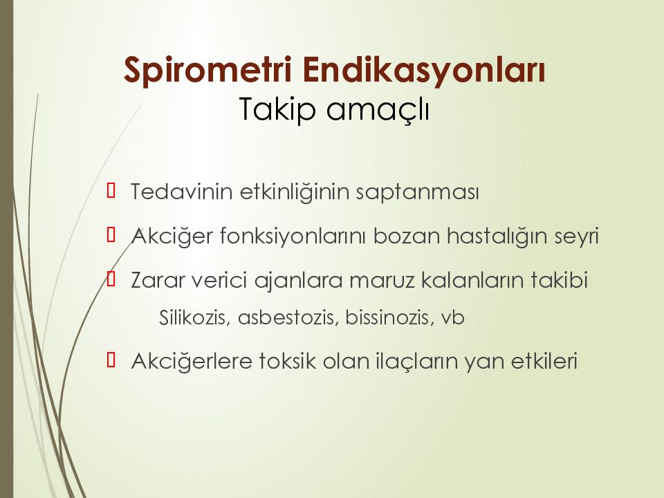 Tedavinin etkinliğinin saptanması Akciğer fonksiyonlarını bozan hastalığın seyri Zarar verici ajanlara maruz kalanların takibi Silikozis, asbestozis, bissinozis, vb Akciğerlere toksik olan ilaçların yan etkileri Spirometri Endikasyonları Takip amaçlı