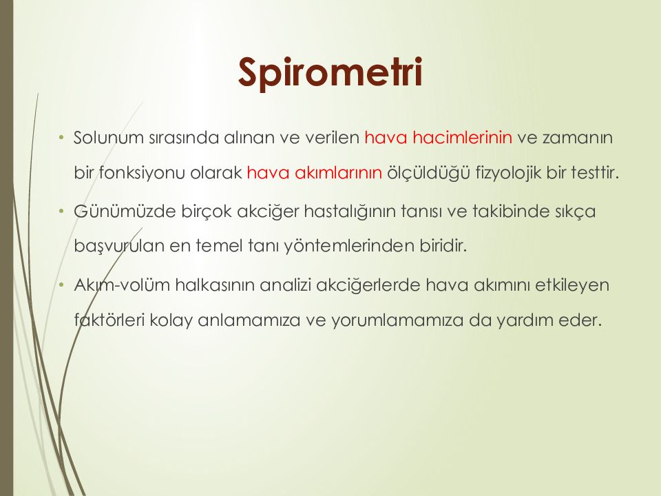 Solunum sırasında alınan ve verilen hava hacimlerinin ve zamanın bir fonksiyonu olarak hava akımlarının ölçüldüğü fizyolojik bir testtir. Günümüzde birçok akciğer hastalığının tanısı ve takibinde sıkça başvurulan en temel tanı yöntemlerinden biridir. Akım-volüm halkasının analizi akciğerlerde hava akımını etkileyen faktörleri kolay anlamamıza ve yorumlamamıza da yardım eder. Spirometri
