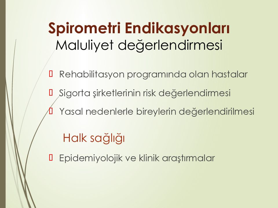 Rehabilitasyon programında olan hastalar Sigorta şirketlerinin risk değerlendirmesi Yasal nedenlerle bireylerin değerlendirilmesi Halk sağlığı Epidemiyolojik ve klinik araştırmalar Spirometri Endikasyonları Maluliyet değerlendirmesi