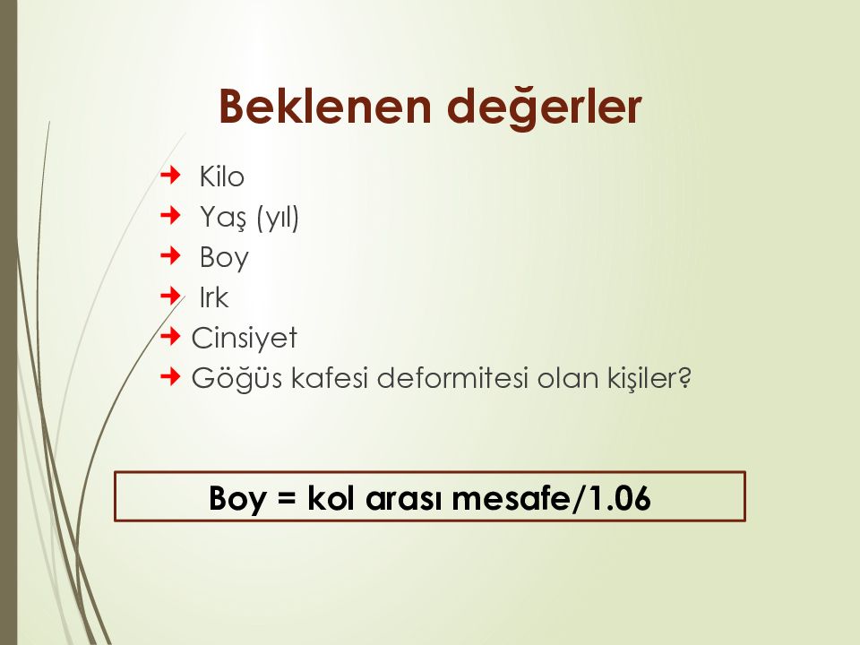 Kilo Yaş (yıl) Boy Irk Cinsiyet Göğüs kafesi deformitesi olan kişiler? Boy = kol arası mesafe/1.06 Beklenen değerler