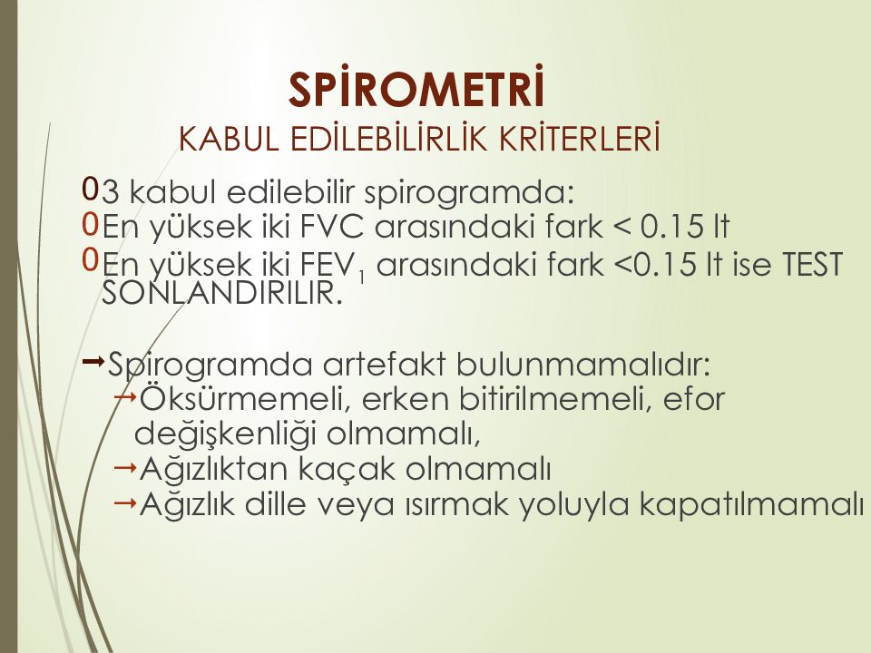 3 kabul edilebilir spirogramda: En yüksek iki FVC arasındaki fark < 0.15 lt En yüksek iki FEV 1 arasındaki fark <0.15 lt ise TEST SONLANDIRILIR. Spirogramda artefakt bulunmamalıdır: Öksürmemeli, erken bitirilmemeli, efor değişkenliği olmamalı, Ağızlıktan kaçak olmamalı Ağızlık dille veya ısırmak yoluyla kapatılmamalı SPİROMETRİ KABUL EDİLEBİLİRLİK KRİTERLERİ