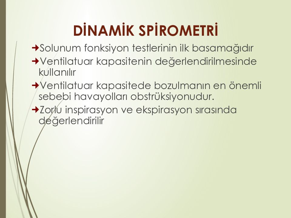 Solunum fonksiyon testlerinin ilk basamağıdır Ventilatuar kapasitenin değerlendirilmesinde kullanılır Ventilatuar kapasitede bozulmanın en önemli sebebi havayolları obstrüksiyonudur. Zorlu inspirasyon ve ekspirasyon sırasında değerlendirilir DİNAMİK SPİROMETRİ
