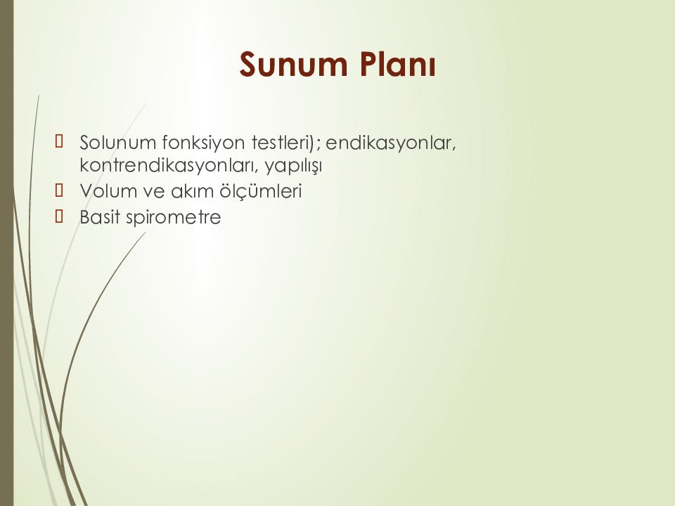 Solunum fonksiyon testleri ); endikasyonlar, kontrendikasyonları, yapılışı Volum ve akım ölçümleri Basit spirometre Sunum Planı