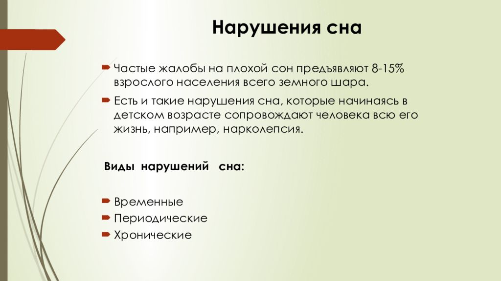 Частые жалобы на плохой сон предъявляют 8-15% взрослого населения всего земного шара. Есть и такие нарушения сна, которые начинаясь в детском возрасте сопровождают человека всю его жизнь, например, нарколепсия. Виды нарушений сна: Временные Периодические Хронические