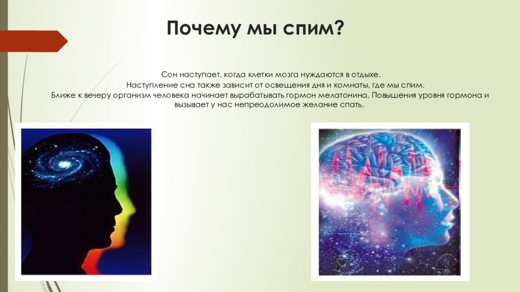 Сон наступает, когда клетки мозга нуждаются в отдыхе. Наступление сна также зависит от освещения дня и комнаты, где мы спим. Ближе к вечеру организм человека начинает вырабатывать гормон мелатонина. Повышения уровня гормона и вызывает у нас непреодолимое желание спать.