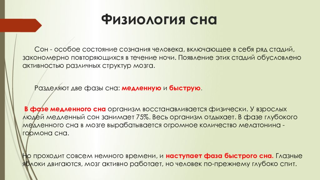 Сон - особое состояние сознания человека, включающее в себя ряд стадий, закономерно повторяющихся в течение ночи. Появление этих стадий обусловлено активностью различных структур мозга. Разделяют две фазы сна: медленную и быструю. В фазе медленного сна организм восстанавливается физически. У взрослых людей медленный сон занимает 75%. Весь организм отдыхает. В фазе глубокого медленного сна в мозге вырабатывается огромное количество мелатонина - гормона сна. Но проходит совсем немного времени, и наступает фаза быстрого сна. Глазные яблоки двигаются, мозг активно работает, но человек по-прежнему глубоко спит.