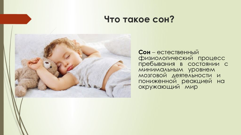 Сон – естественный физиологический процесс пребывания в состоянии с минимальным уровнем мозговой деятельности и пониженной реакцией на окружающий мир Что такое сон?