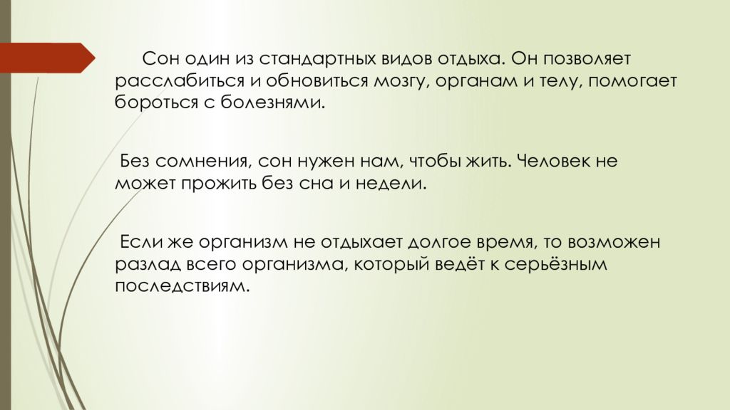 Сон один из стандартных видов отдыха. Он позволяет расслабиться и обновиться мозгу, органам и телу, помогает бороться с болезнями. Без сомнения, сон нужен нам, чтобы жить. Человек не может прожить без сна и недели. Если же организм не отдыхает долгое время, то возможен разлад всего организма, который ведёт к серьёзным последствиям.