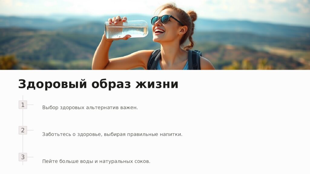 Здоровый образ жизни 1 2 3 Выбор здоровых альтернатив важен. Заботьтесь о здоровье, выбирая правильные напитки. Пейте больше воды и натуральных соков.