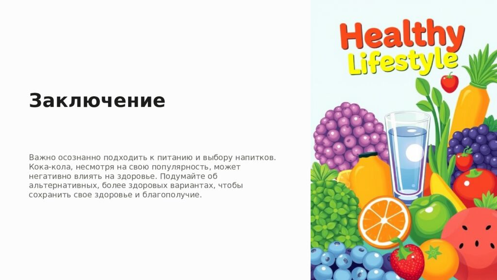 Заключение Важно осознанно подходить к питанию и выбору напитков. Кока-кола, несмотря на свою популярность, может негативно влиять на здоровье. Подумайте об альтернативных, более здоровых вариантах, чтобы сохранить свое здоровье и благополучие.