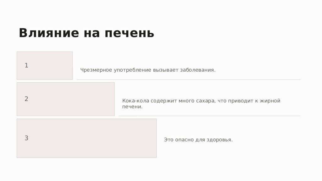 Влияние на печень 1 Чрезмерное употребление вызывает заболевания. 2 Кока-кола содержит много сахара, что приводит к жирной печени. 3 Это опасно для здоровья.