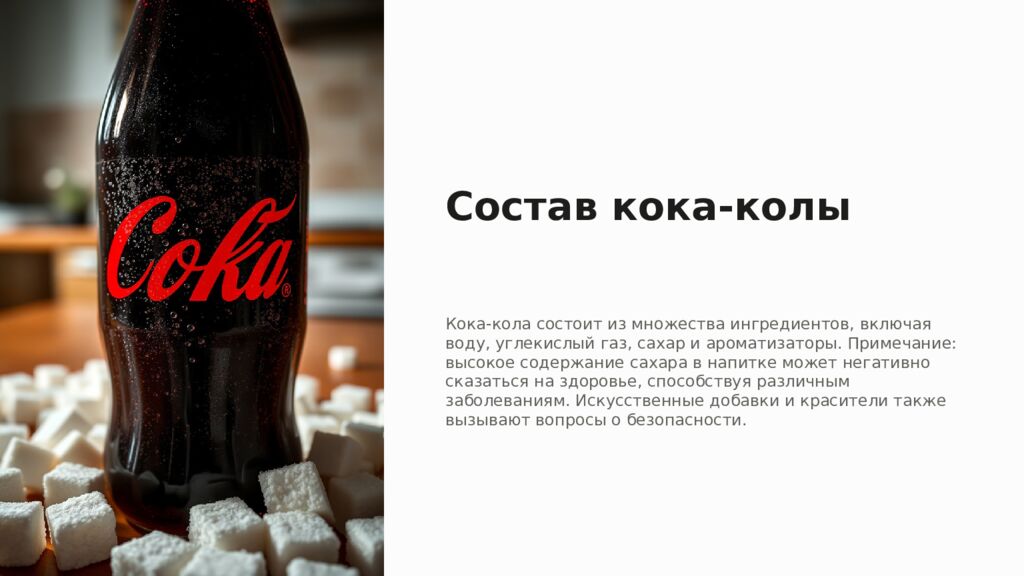 Состав кока-колы Кока-кола состоит из множества ингредиентов, включая воду, углекислый газ, сахар и ароматизаторы. Примечание: высокое содержание сахара в напитке может негативно сказаться на здоровье, способствуя различным заболеваниям. Искусственные добавки и красители также вызывают вопросы о безопасности.
