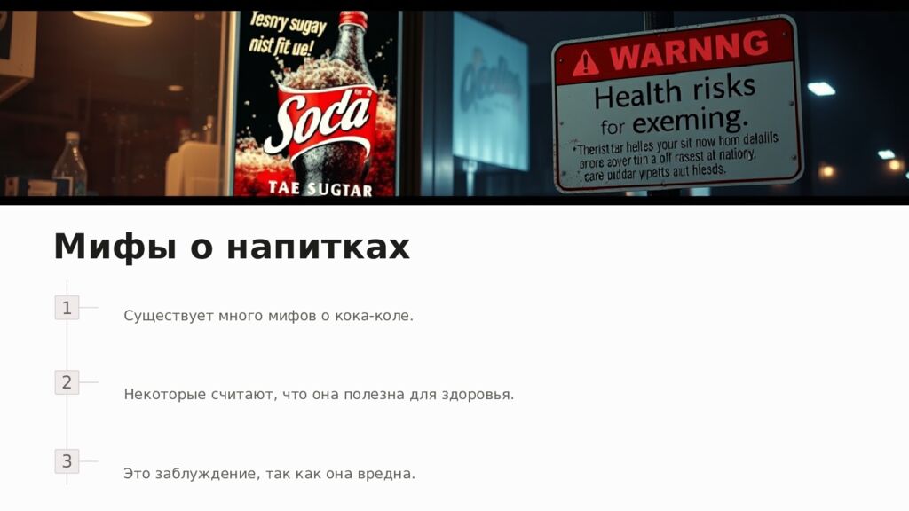 Мифы о напитках 1 2 3 Существует много мифов о кока-коле. Некоторые считают, что она полезна для здоровья. Это заблуждение, так как она вредна.