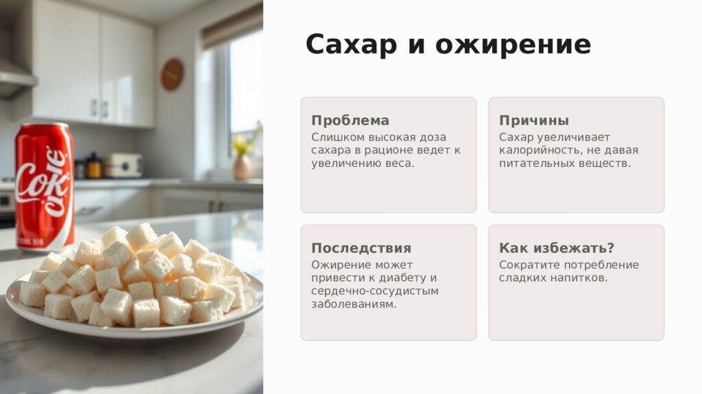 Сахар и ожирение Проблема Слишком высокая доза сахара в рационе ведет к увеличению веса. Причины Сахар увеличивает калорийность, не давая питательных веществ. Последствия Ожирение может привести к диабету и сердечно-сосудистым заболеваниям. Как избежать? Сократите потребление сладких напитков.