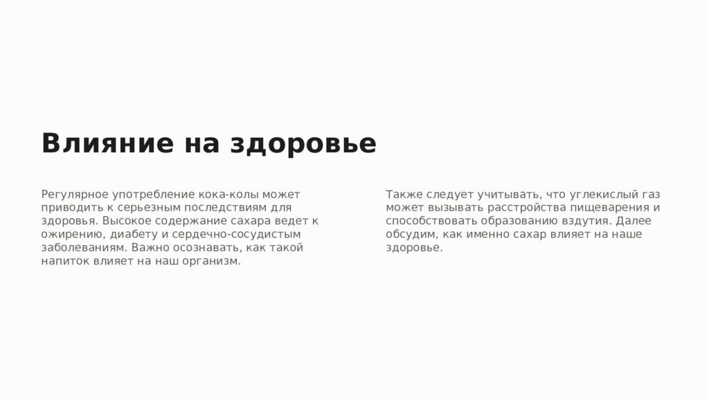 Влияние на здоровье Регулярное употребление кока-колы может приводить к серьезным последствиям для здоровья. Высокое содержание сахара ведет к ожирению, диабету и сердечно-сосудистым заболеваниям. Важно осознавать, как такой напиток влияет на наш организм. Также следует учитывать, что углекислый газ может вызывать расстройства пищеварения и способствовать образованию вздутия. Далее обсудим, как именно сахар влияет на наше здоровье.