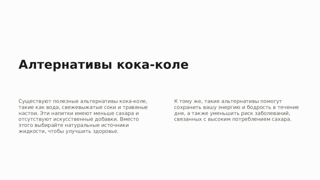 Алтернативы кока-коле Существуют полезные альтернативы кока-коле, такие как вода, свежевыжатые соки и травяные настои. Эти напитки имеют меньше сахара и отсутствуют искусственные добавки. Вместо этого выбирайте натуральные источники жидкости, чтобы улучшить здоровье. К тому же, такие альтернативы помогут сохранить вашу энергию и бодрость в течение дня, а также уменьшить риск заболеваний, связанных с высоким потреблением сахара.