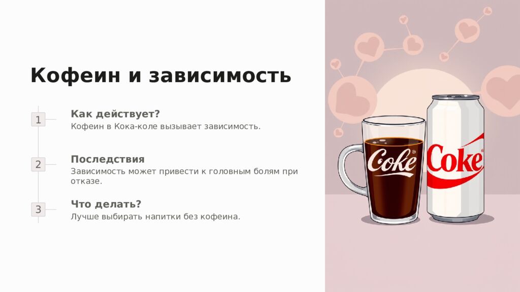 Кофеин и зависимость 1 2 3 Как действует? Кофеин в Кока-коле вызывает зависимость. Последствия Зависимость может привести к головным болям при отказе. Что делать? Лучше выбирать напитки без кофеина.