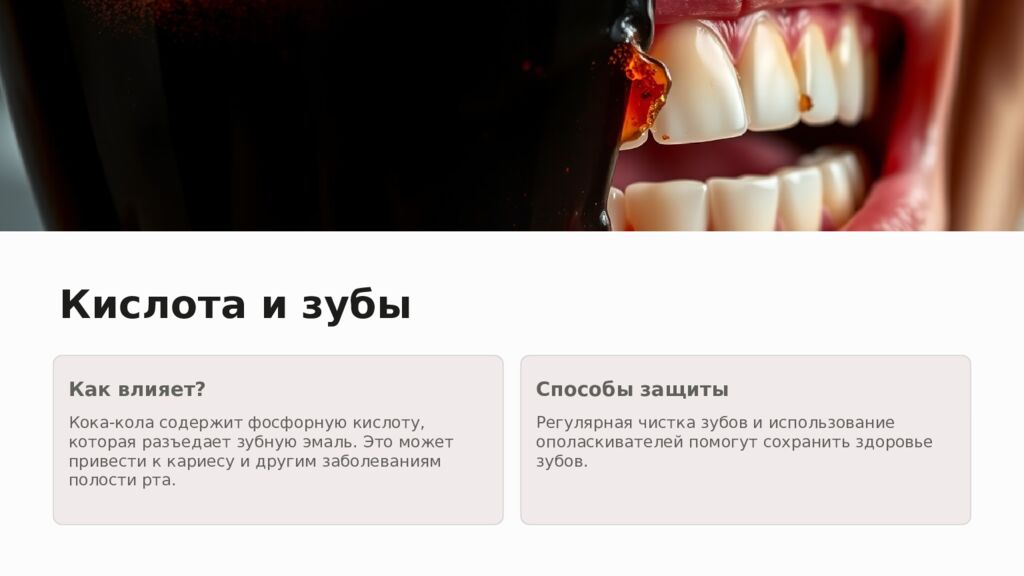 Кислота и зубы Как влияет? Кока-кола содержит фосфорную кислоту, которая разъедает зубную эмаль. Это может привести к кариесу и другим заболеваниям полости рта. Способы защиты Регулярная чистка зубов и использование ополаскивателей помогут сохранить здоровье зубов.