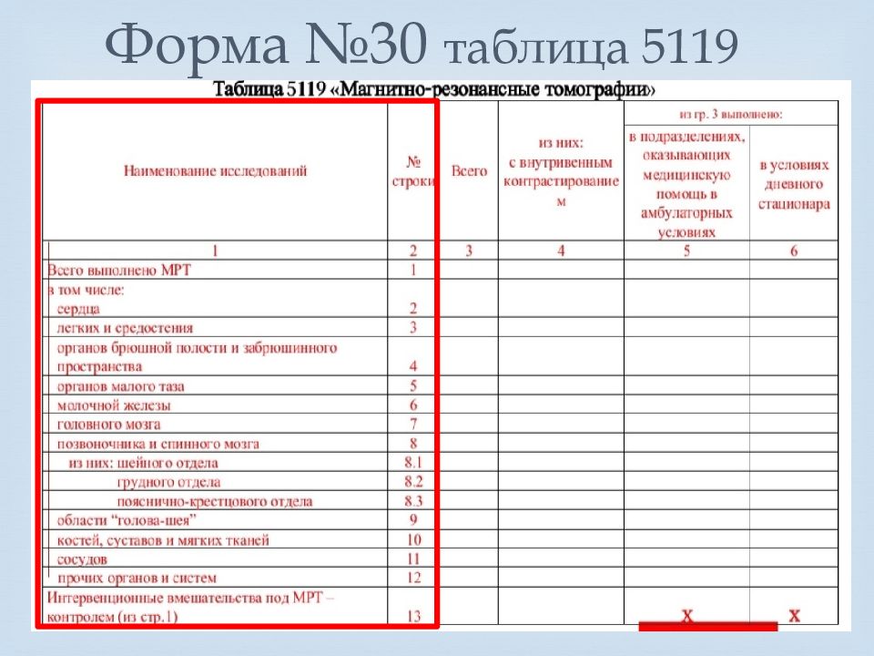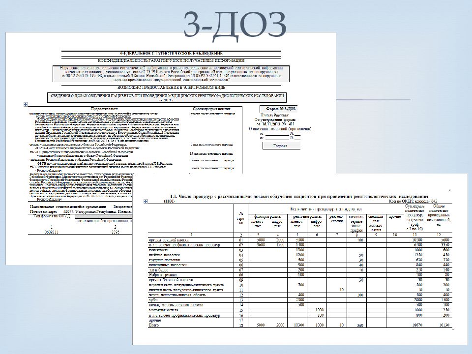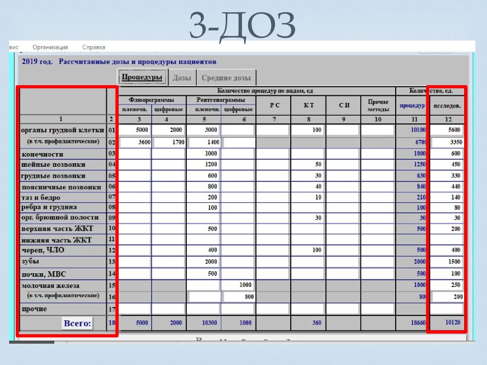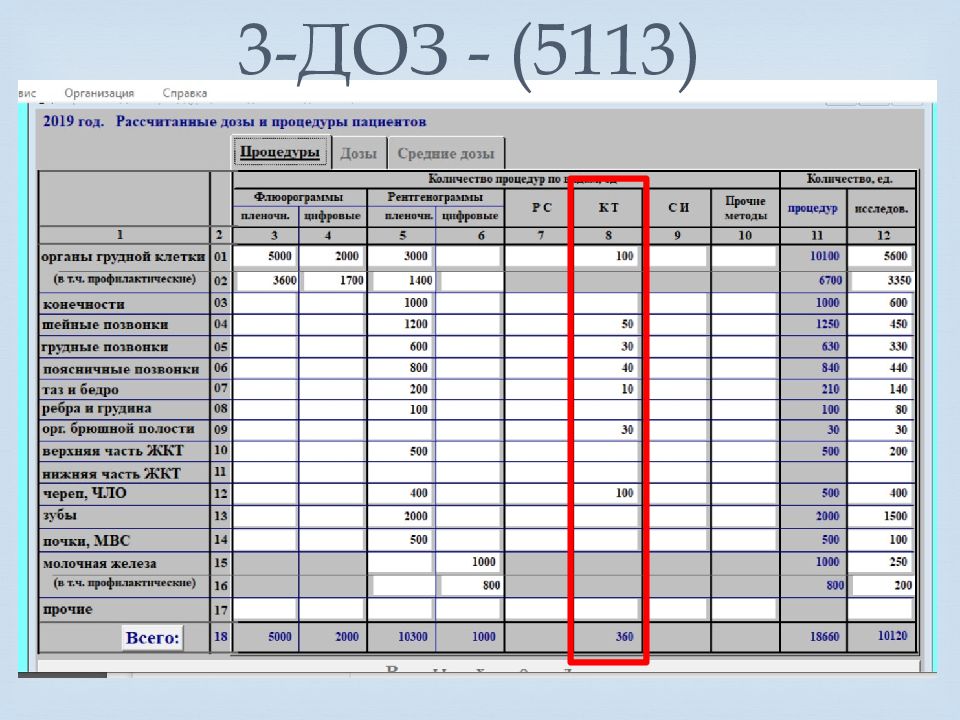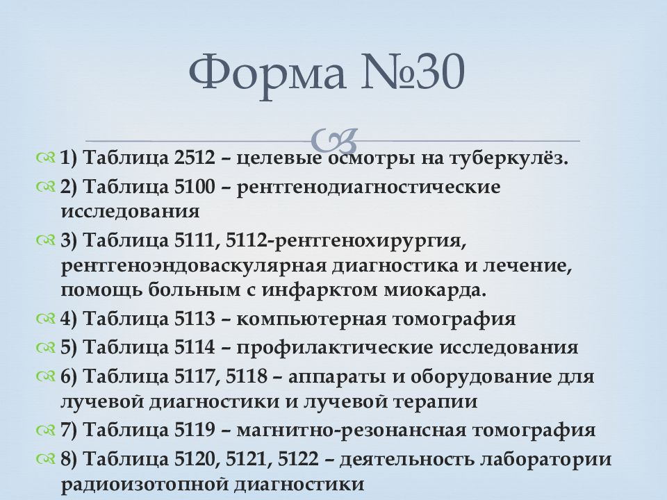 1) Таблица 2512 – целевые осмотры на туберкулёз. 2) Таблица 5100 – рентгенодиагностические исследования 3 ) Таблица 5111, 5112-рентгенохирургия, рентгеноэндоваскулярная диагностика и лечение, помощь больным с инфарктом миокарда. 4) Таблица 5113 – компьютерная томография 5) Таблица 5114 – профилактические исследования 6 ) Таблица 5117, 5118 – аппараты и оборудование для лучевой диагностики и лучевой терапии 7 ) Таблица 5119 – магнитно-резонансная томография 8 ) Таблица 5120, 5121, 5122 – деятельность лаборатории радиоизотопной диагностики