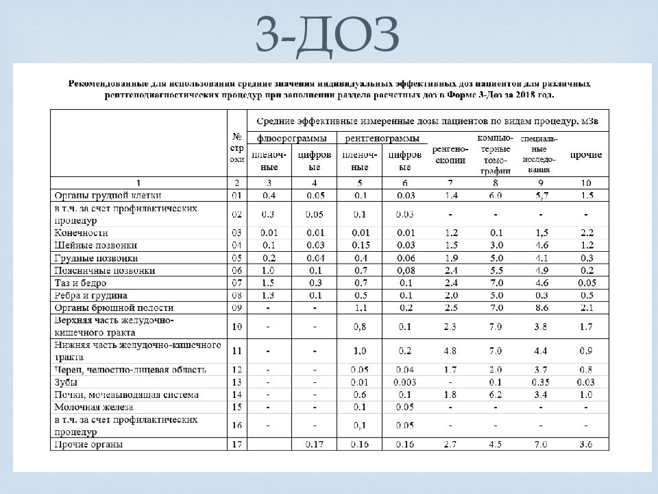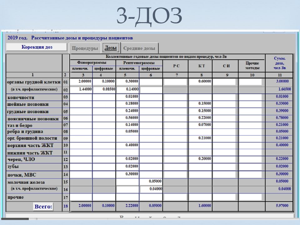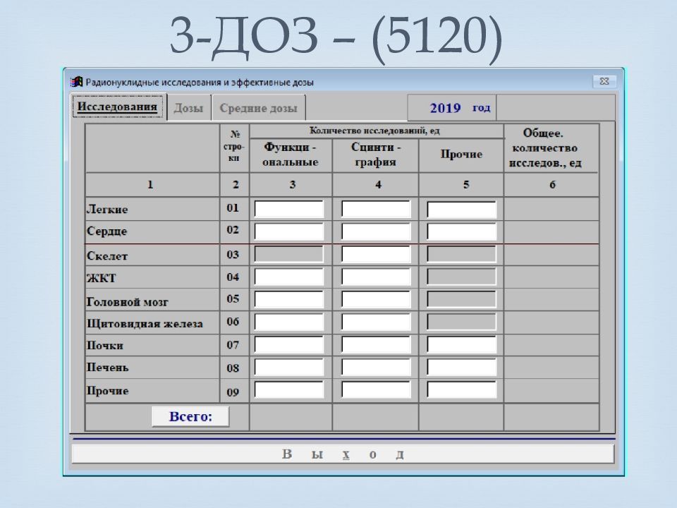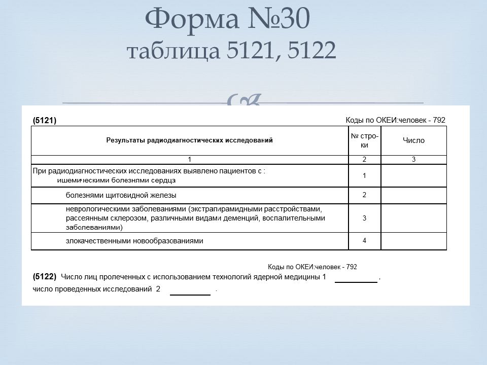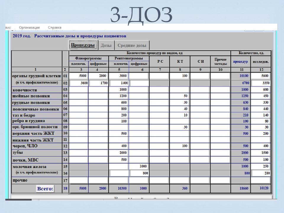 1) Таблица 2512 – целевые осмотры на туберкулёз. 2) Таблица 5100 – рентгенодиагностические исследования 3 ) Таблица 5111, 5112-рентгенохирургия, рентгеноэндоваскулярная диагностика и лечение, помощь больным с инфарктом миокарда. 4) Таблица 5113 – компьютерная томография 5) Таблица 5114 – профилактические исследования 6 ) Таблица 5117, 5118 – аппараты и оборудование для лучевой диагностики и лучевой терапии 7 ) Таблица 5119 – магнитно-резонансная томография 8 ) Таблица 5120, 5121, 5122 – деятельность лаборатории радиоизотопной диагностики