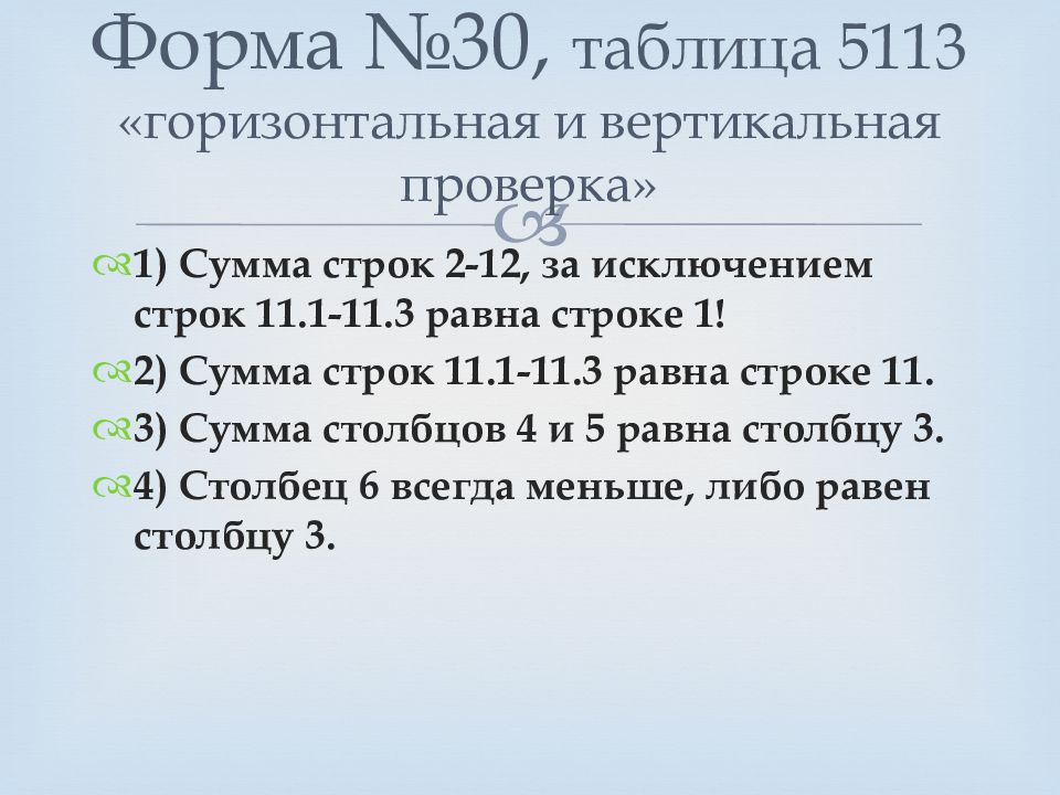 1) Сумма строк 2-12, за исключением строк 11.1-11.3 равна строке 1! 2) Сумма строк 11.1-11.3 равна строке 11. 3) Сумма столбцов 4 и 5 равна столбцу 3. 4) Столбец 6 всегда меньше, либо равен столбцу 3. Форма № 30, таблица 5113 «горизонтальная и вертикальная проверка»