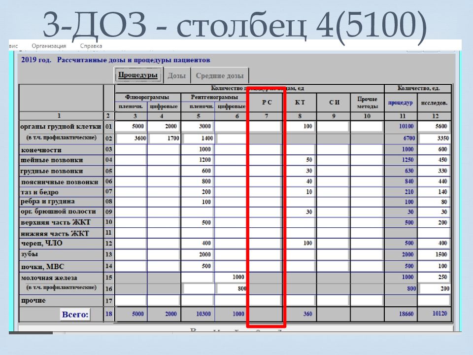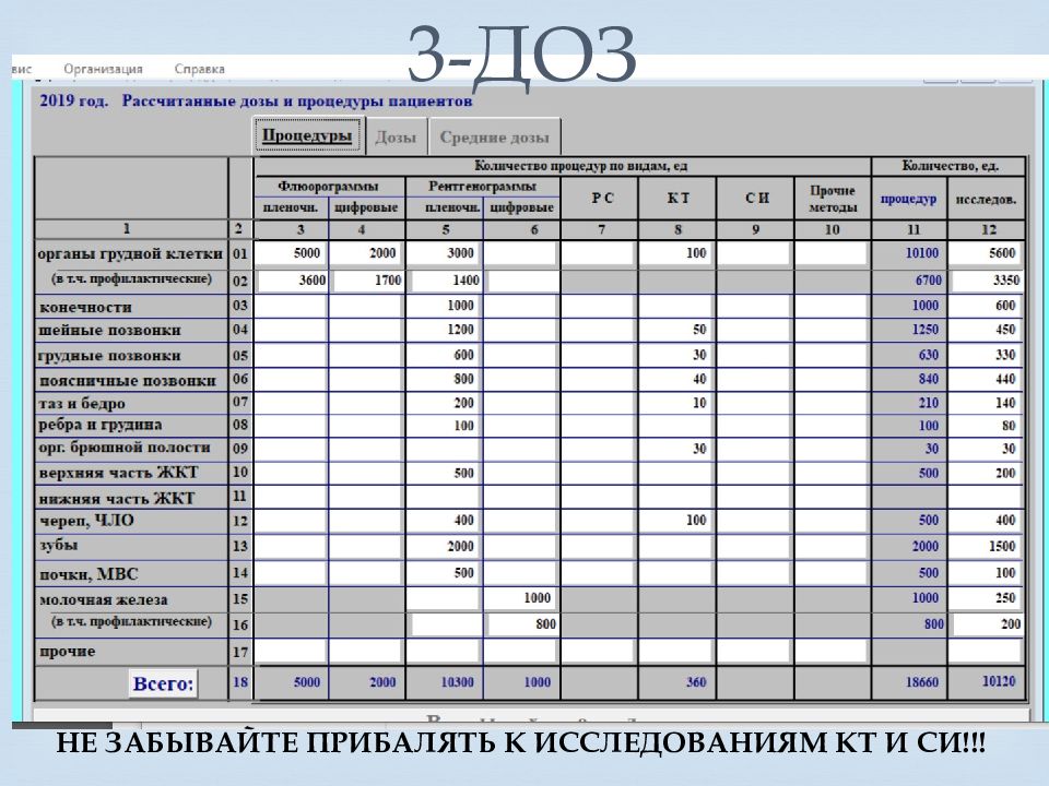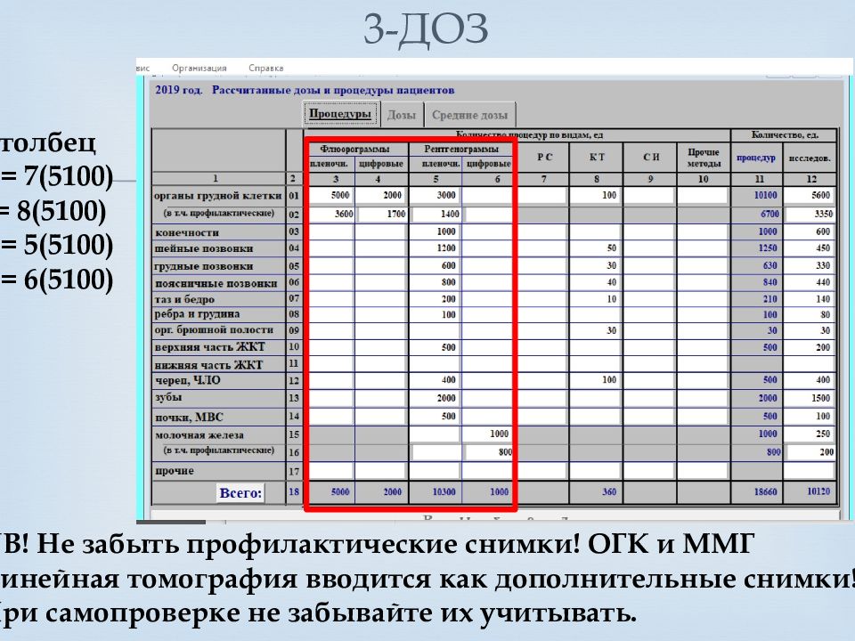 Столбец 3 = 7(5100) 4= 8(5100) 5 = 5(5100) 6 = 6(5100) NB! Не забыть профилактические снимки! ОГК и ММГ Линейная томография вводится как дополнительные снимки!!! При самопроверке не забывайте их учитывать.