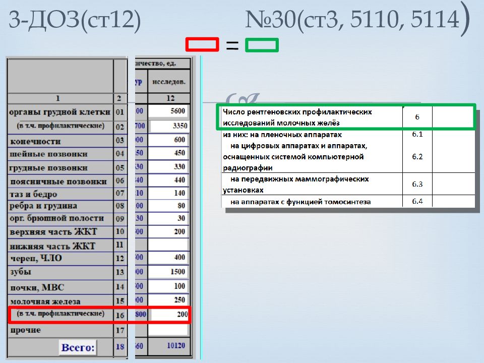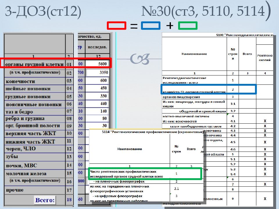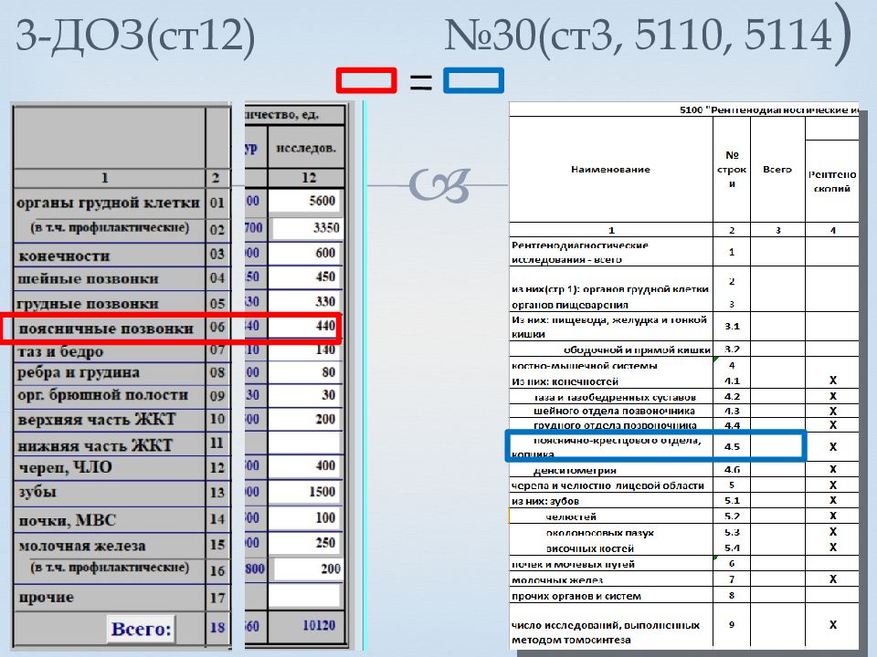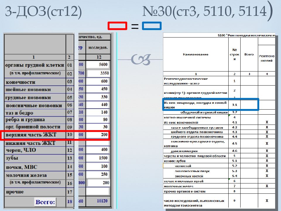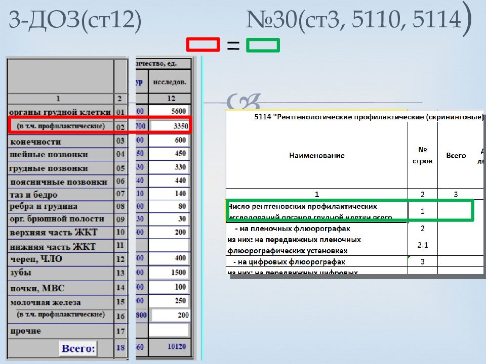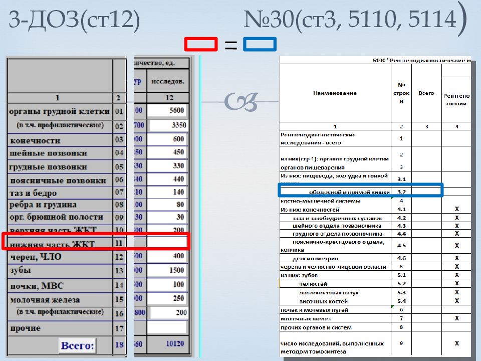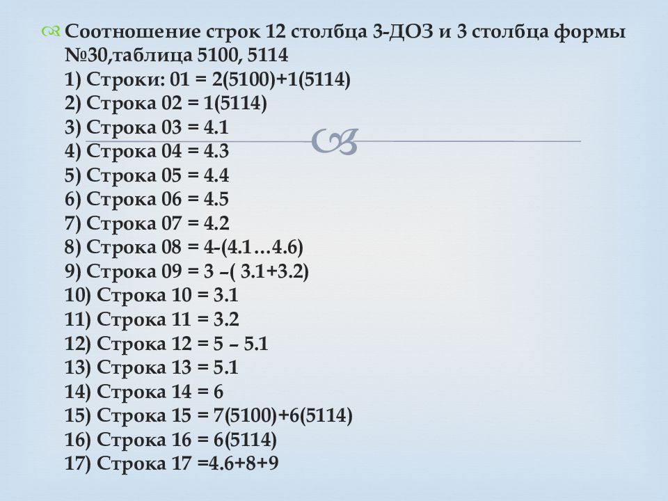 Соотношение строк 12 столбца 3-ДОЗ и 3 столбца формы №30,таблица 5100, 5114 1) Строки: 01 = 2(5100)+1(5114) 2) Строка 02 = 1(5114) 3) Строка 03 = 4.1 4) Строка 04 = 4.3 5) Строка 05 = 4.4 6) Строка 06 = 4.5 7) Строка 07 = 4.2 8) Строка 08 = 4-(4.1…4.6) 9) Строка 09 = 3 –( 3.1+3.2) 10) Строка 10 = 3.1 11) Строка 11 = 3.2 12) Строка 12 = 5 – 5.1 13) Строка 13 = 5.1 14) Строка 14 = 6 15) Строка 15 = 7(5100)+6(5114) 16) Строка 16 = 6(5114) 17) Строка 17 =4.6+8+9