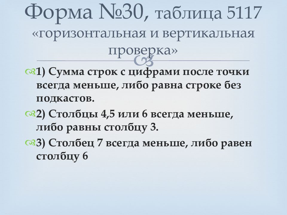 1) Сумма строк с цифрами после точки всегда меньше, либо равна строке без подкастов. 2) Столбцы 4,5 или 6 всегда меньше, либо равны столбцу 3. 3) Столбец 7 всегда меньше, либо равен столбцу 6 Форма № 30, таблица 5117 «горизонтальная и вертикальная проверка»