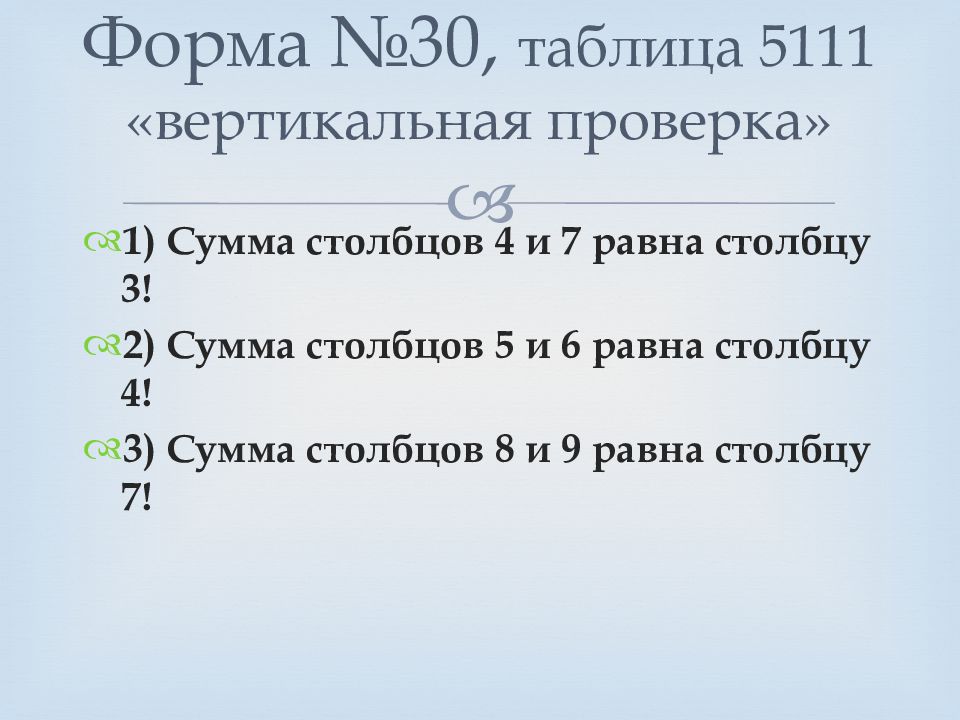 1) Сумма столбцов 4 и 7 равна столбцу 3! 2) Сумма столбцов 5 и 6 равна столбцу 4! 3) Сумма столбцов 8 и 9 равна столбцу 7! Форма № 30, таблица 5111 «вертикальная проверка»