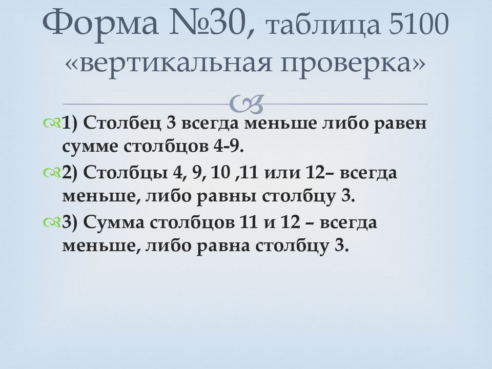 1) Столбец 3 всегда меньше либо равен сумме столбцов 4-9. 2) Столбцы 4, 9, 10,11 или 12– всегда меньше, либо равны столбцу 3. 3) Сумма столбцов 11 и 12 – всегда меньше, либо равна столбцу 3. Форма № 30, таблица 5100 «вертикальная проверка»