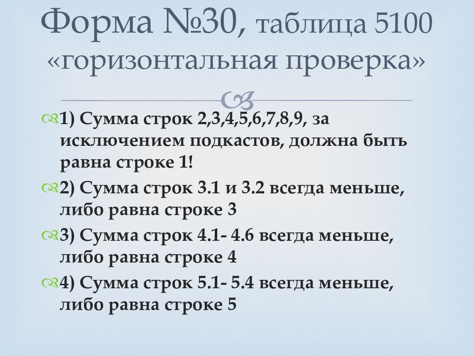 1) Сумма строк 2,3,4,5,6,7,8,9, за исключением подкастов, должна быть равна строке 1! 2) Сумма строк 3.1 и 3.2 всегда меньше, либо равна строке 3 3) Сумма строк 4.1- 4.6 всегда меньше, либо равна строке 4 4) Сумма строк 5.1- 5.4 всегда меньше, либо равна строке 5 Форма № 30, таблица 5100 «горизонтальная проверка»
