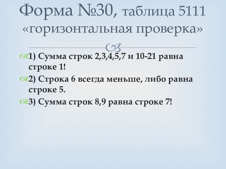 1) Сумма строк 2,3,4,5,7 и 10-21 равна строке 1! 2) Строка 6 всегда меньше, либо равна строке 5. 3) Сумма строк 8,9 равна строке 7! Форма № 30, таблица 5111 «горизонтальная проверка»