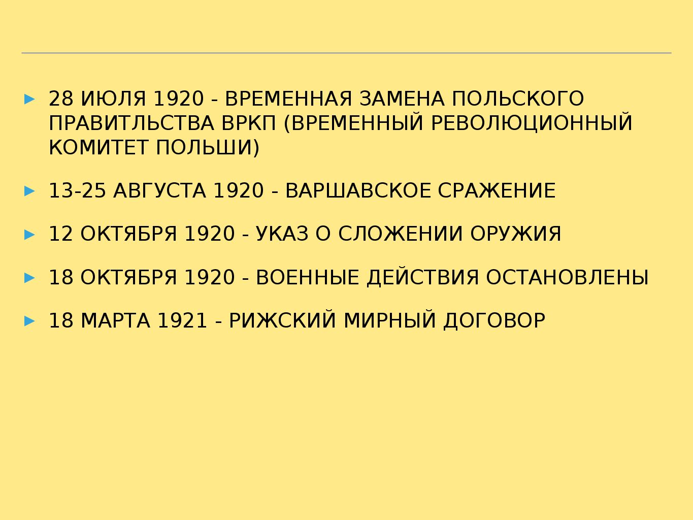 28 ИЮЛЯ 1920 - ВРЕМЕННАЯ ЗАМЕНА ПОЛЬСКОГО ПРАВИТЛЬСТВА ВРКП (ВРЕМЕННЫЙ РЕВОЛЮЦИОННЫЙ КОМИТЕТ ПОЛЬШИ) 13-25 АВГУСТА 1920 - ВАРШАВСКОЕ СРАЖЕНИЕ 12 ОКТЯБРЯ 1920 - УКАЗ О СЛОЖЕНИИ ОРУЖИЯ 18 ОКТЯБРЯ 1920 - ВОЕННЫЕ ДЕЙСТВИЯ ОСТАНОВЛЕНЫ 18 МАРТА 1921 - РИЖСКИЙ МИРНЫЙ ДОГОВОР