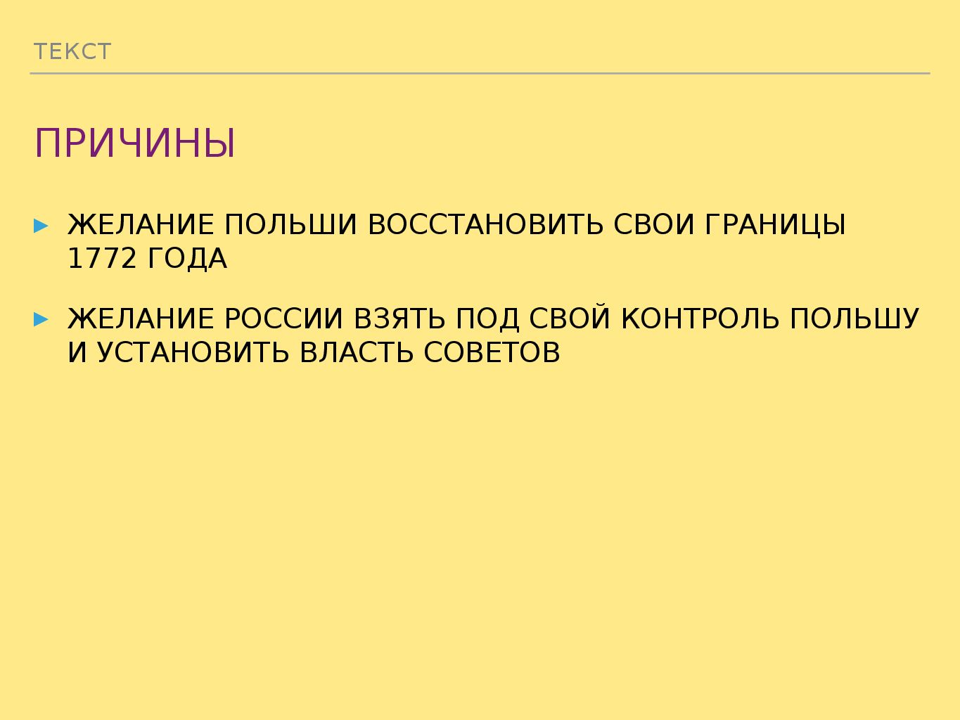 Текст Причины ЖЕЛАНИЕ ПОЛЬШИ ВОССТАНОВИТЬ СВОИ ГРАНИЦЫ 1772 ГОДА ЖЕЛАНИЕ РОССИИ ВЗЯТЬ ПОД СВОЙ КОНТРОЛЬ ПОЛЬШУ И УСТАНОВИТЬ ВЛАСТЬ СОВЕТОВ